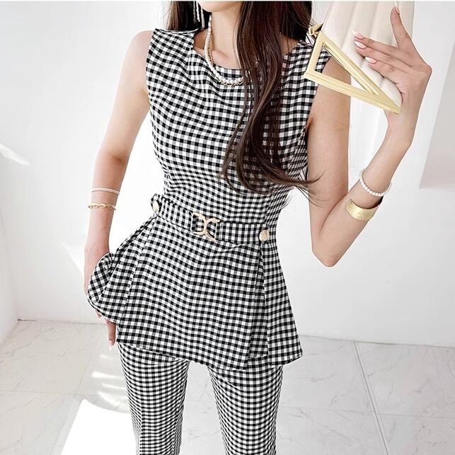 シックでおしゃれなモノトーンギンガムチェックセットアップです。トップスはワイドなシルエットで、ワンピース感覚で楽しめるアイテム。ボトムスはクロップド丈のワイドパンツで、足元をすっきりと見せてくれます。