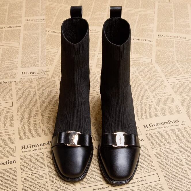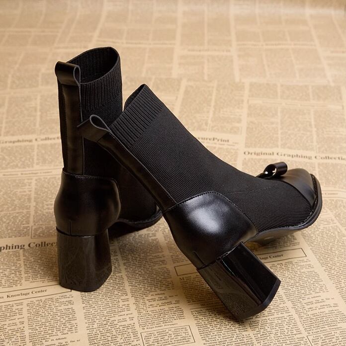 黒いニット素材と可愛らしいリボンが特徴のこのショートブーツは、どんなコーディネートにも合わせやすく、足元を華やかに演出してくれます。