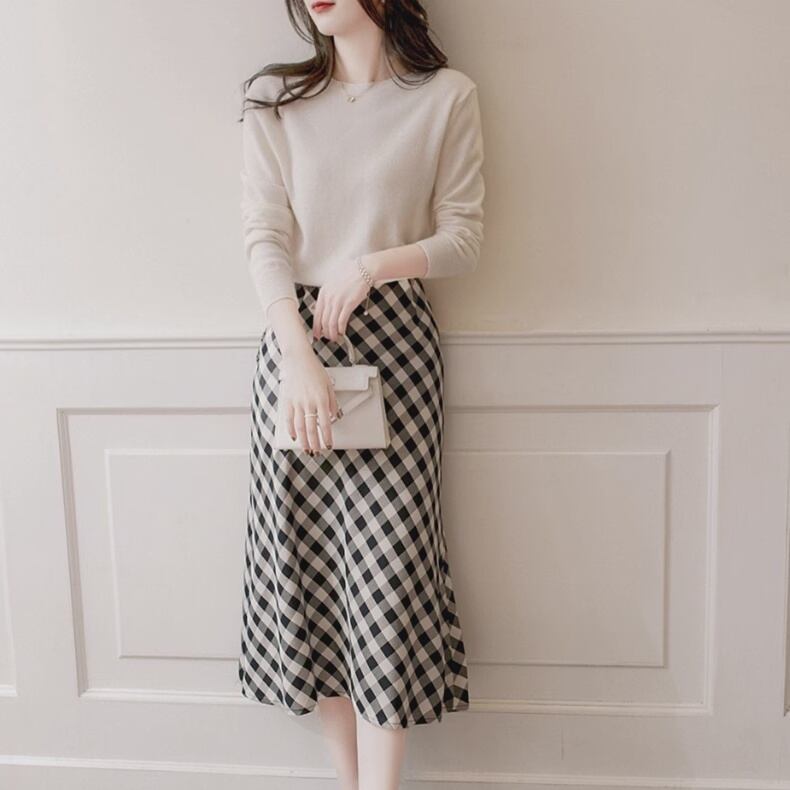ベージュニットとチェックスカートのコーディネートが完成するセットです♡